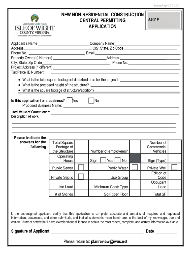 Revised April 27, 2021NEW NONRESIDENTIAL CONSTRUCTION APP # CENTRAL PERMITTING APPLICATION Applicants Name Company Name Address City, State, Zip Code Phone No. ___ Email___ Property Owner(s) Name(s)