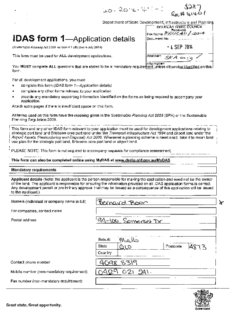 3an aric_t 4 140(Department of State Dave OpenAI Infrastructure and Planning DOUGLAS SHIRE COUNCIL Received /, \' 4 Ale Name P1 e u C 4 No. Documents form 1Application details P 2014 4S(Sustainable