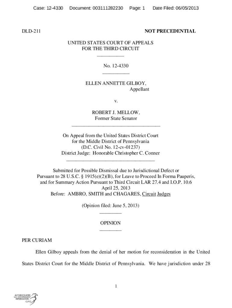 Case: 124330Document: 003111282230Page: 1DLD211Date Filed: 06/05/2013NOT PRESIDENTIAL UNITED STATES COURT OF APPEALS FOR THE THIRD CIRCUIT ___ No. 124330 ___ ELLEN ANNETTE GILROY, Appellant v. ROBERT