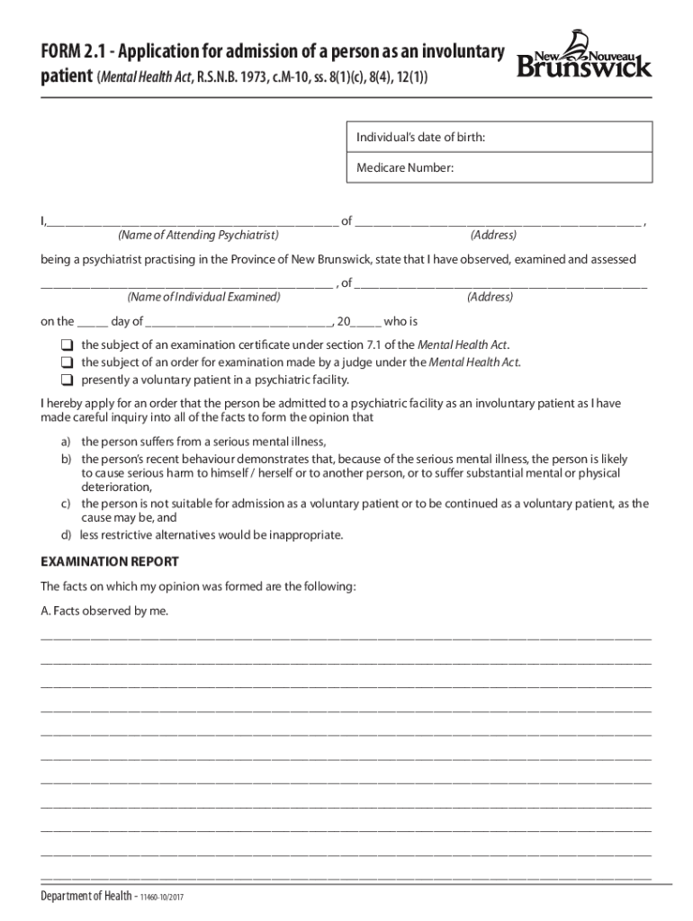 FORM 2.1 Application for admission of a person as an involuntary patient (Mental Health Act, R.S.N.B. 1973, c. M10, SS. 8(1)(c), 8(4), 12(1)) Individuals date of birth: Medicare Number:I, ___ of ___,