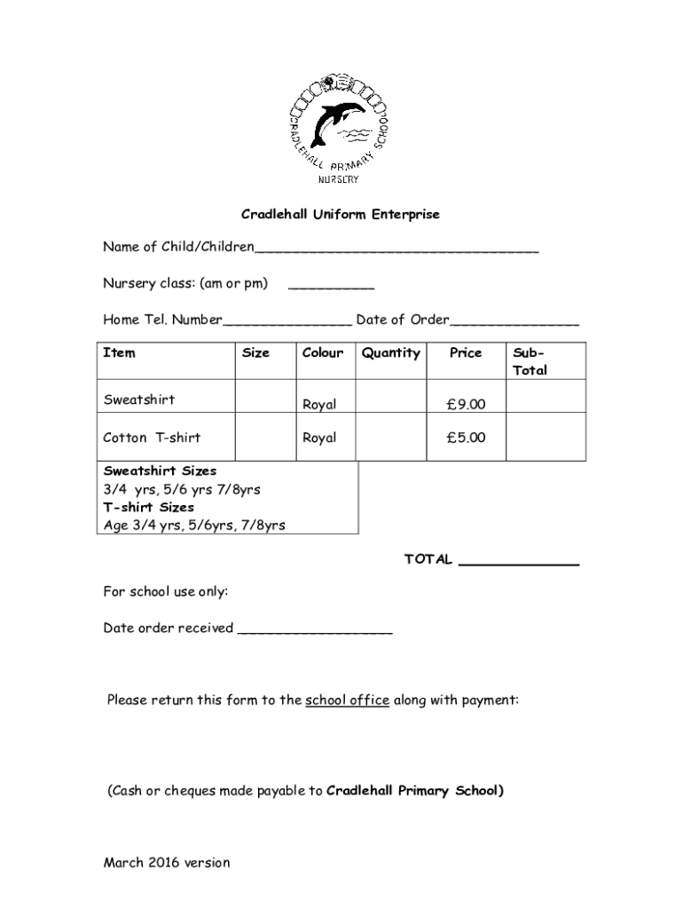 Cradle hall Uniform Enterprise Name of Child/Children___ Nursery class: (am or pm)___Home Tel. Number___ Date of Order___ ItemSizeColourQuantityPriceSweatshirtRoyal9.00Cotton TshirtRoyal5.00SubTotalSweatshirt
