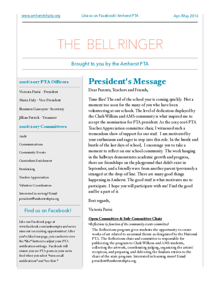 WWW.amherstnhpta.hornlike us on Facebook! Amherst PTA Apr./May 2016THE BELL RINGER