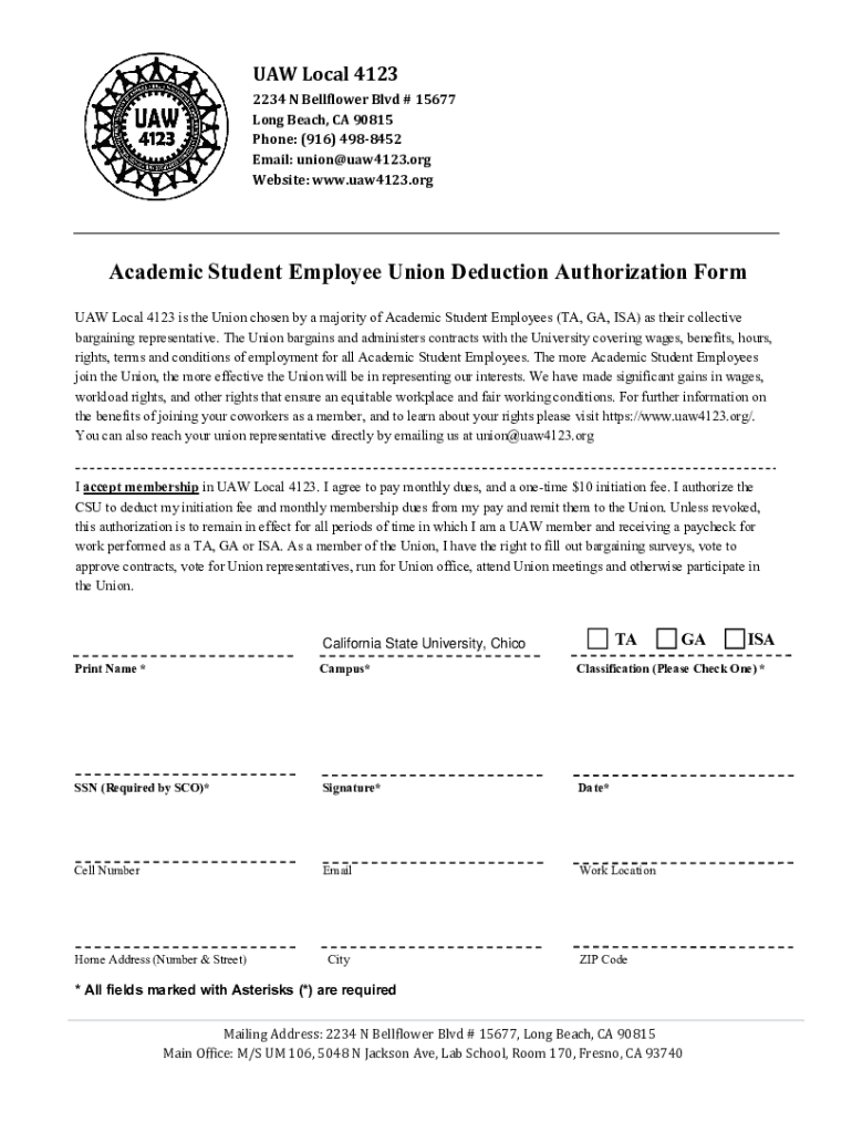 UAW Local 4123 2234 N Bellflower Blvd # 15677 Long Beach, CA 90815 Phone: (916) 4988452 Email: union@uaw4123.org Website: www.uaw4123.orgAcademic Student Employee Union Deduction Authorization Form