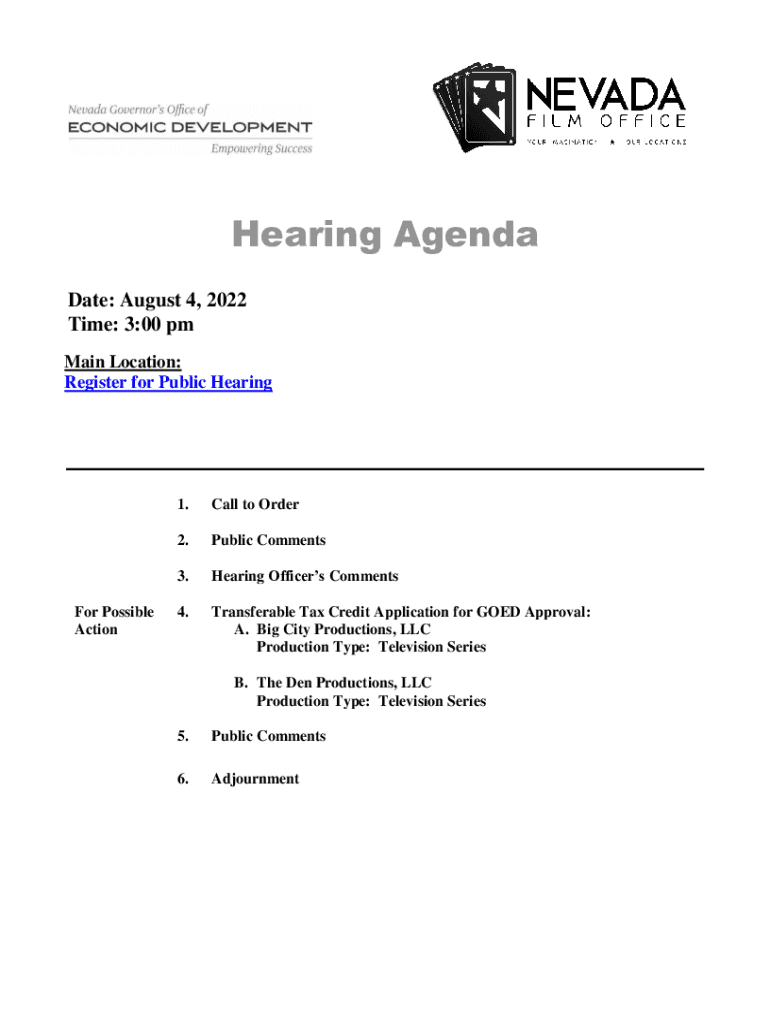 Hearing Agenda Date: August 4, 2022, Time: 3:00 pm Main Location: Register for Public Hearing Possible Action1. Call to Order2. Public Comments3. Hearing Officers Comments4. Transferable Tax Credit