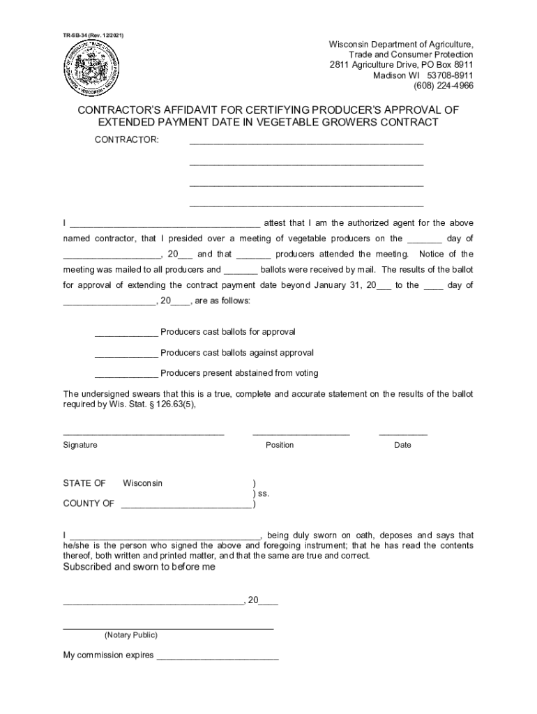 The Contractor’s Affidavit for Extended Payment Date is a legal document used by contractors in Wisconsin to certify that vegetable producers have approved an extended payment date.