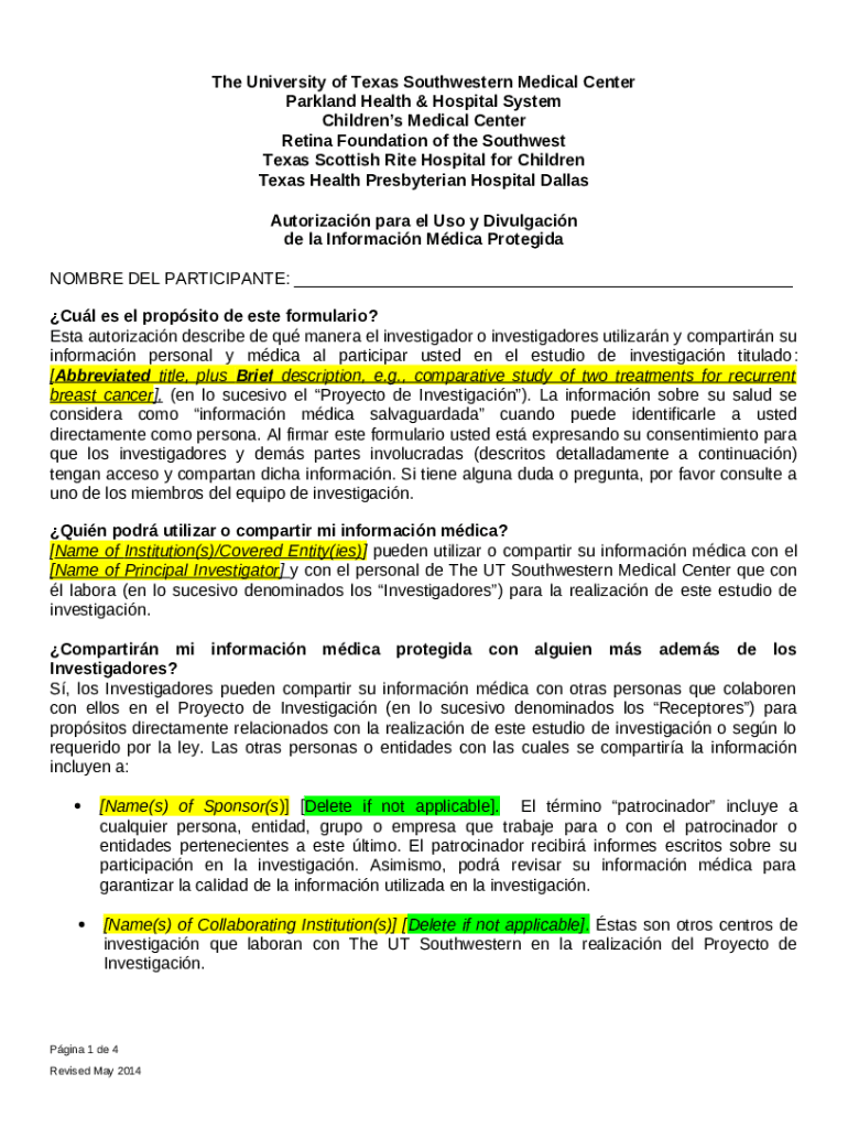 HIPAA Authorization for Research Purposes - Spanish template instructions