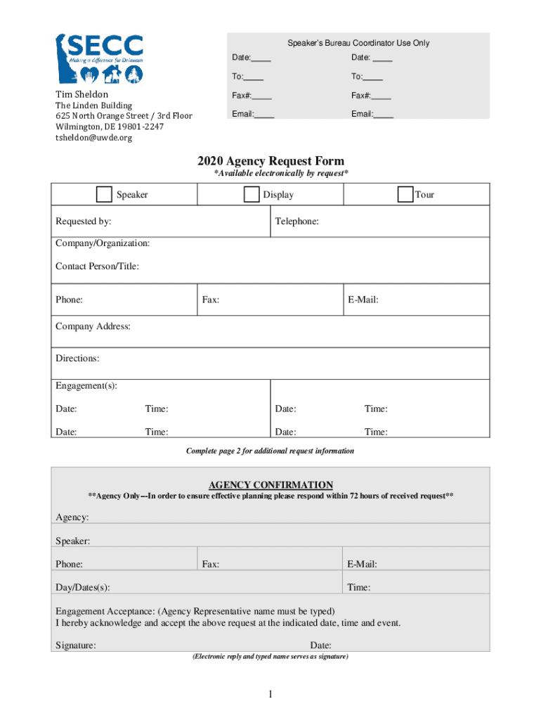 tsheldon@uwde.orgDate:Date:To:To:Fax#:Fax#:Email:Email:2020 Agency Request