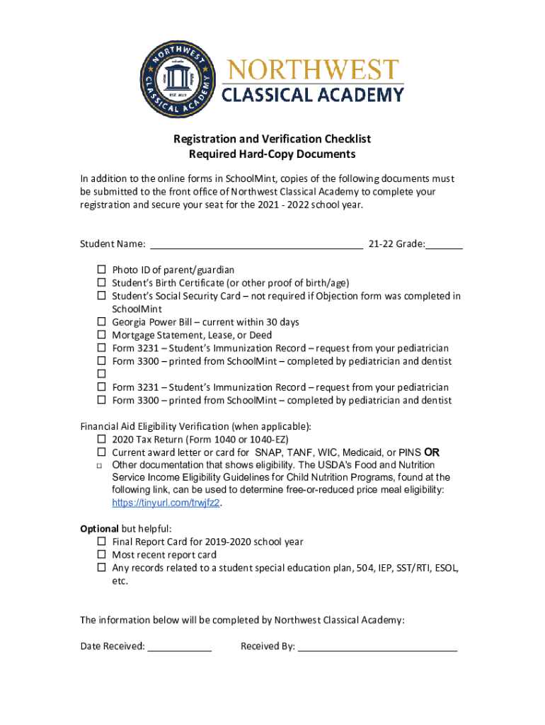 Registration and Verification Checklist Required Hardtop Documents In addition to the online forms in Schooling, copies of the following documents must be submitted to the front office of Northwest