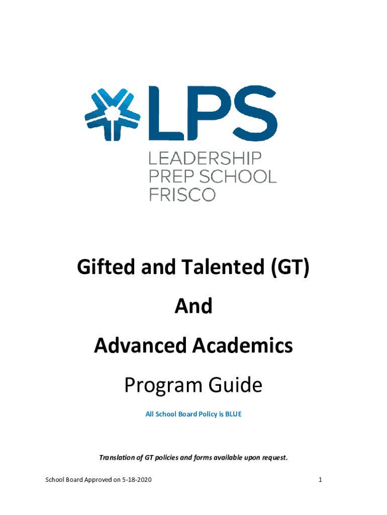 Gifted and Talented (GT) And Advanced Academics Program Guide All School Board Policy is Retranslation of GT policies and forms available upon request. School Board Approved on 51820201TABLE OF CONTENTS