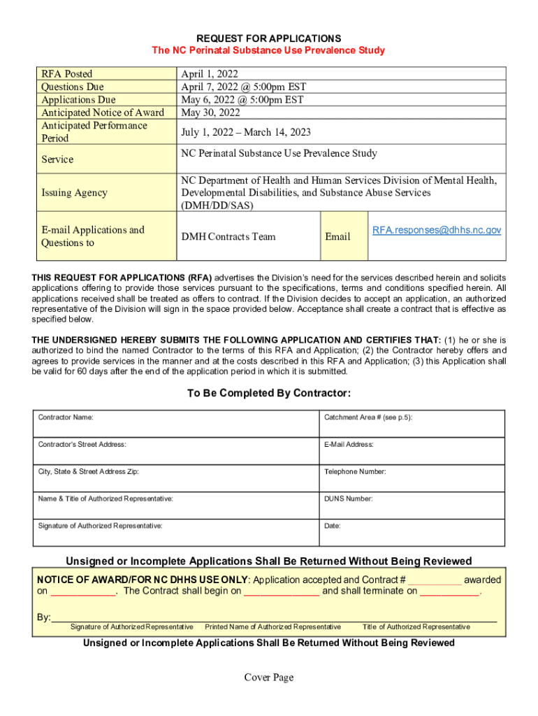 REQUEST FOR APPLICATIONS The NC Perinatal Substance Use Prevalence Study RFA Posted Questions Due Applications Due Anticipated Notice of Award Anticipated Performance Period April 1, 2022, April 7,
