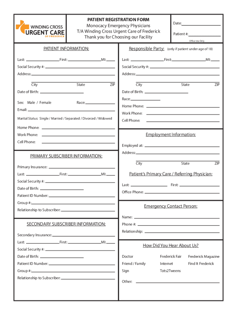 PATIENT REGISTRATION FORM Monogamy Emergency Physicians T/A Winding Cross Urgent Care of Frederick Thank you for Choosing our Facility PATIENT INFORMATION: Last:First:Patient #: Office Use OnlyResponsible