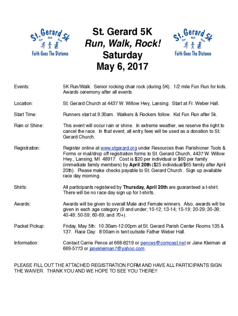 St. Gerard 5K Run, Walk, Rock! Saturday, May 6, 2017, Events:5K Run/Walk. Senior rocking chair rock (during 5K). 1/2 mile Fun Run for kids. Awards ceremony after all events. Location:St. Gerard Church