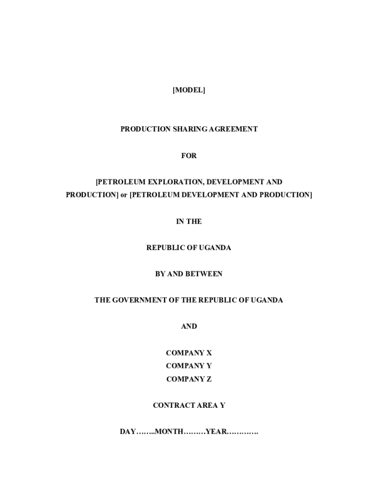 [MODEL]PRODUCTION SHARING AGREEMENT FOR [PETROLEUM EXPLORATION, DEVELOPMENT AND PRODUCTION] or [PETROLEUM DEVELOPMENT AND PRODUCTION] IN THE REPUBLIC OF UGANDA BY AND BETWEEN THE GOVERNMENT OF THE