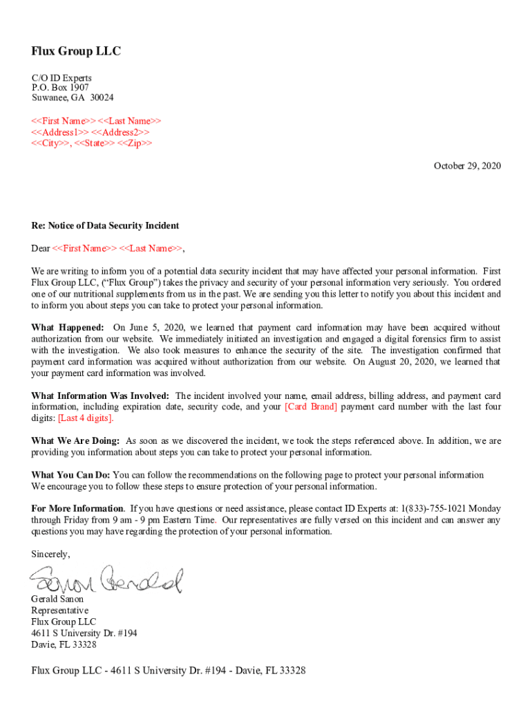 Flux Group LLC C/O ID Experts P.O. Box 1907 Suwanee, GA 30024First Name Last Name Address1 Address2 City, State Zip October 29, 2020Re: Notice of Data Security Incident Dear First Name Last Name,