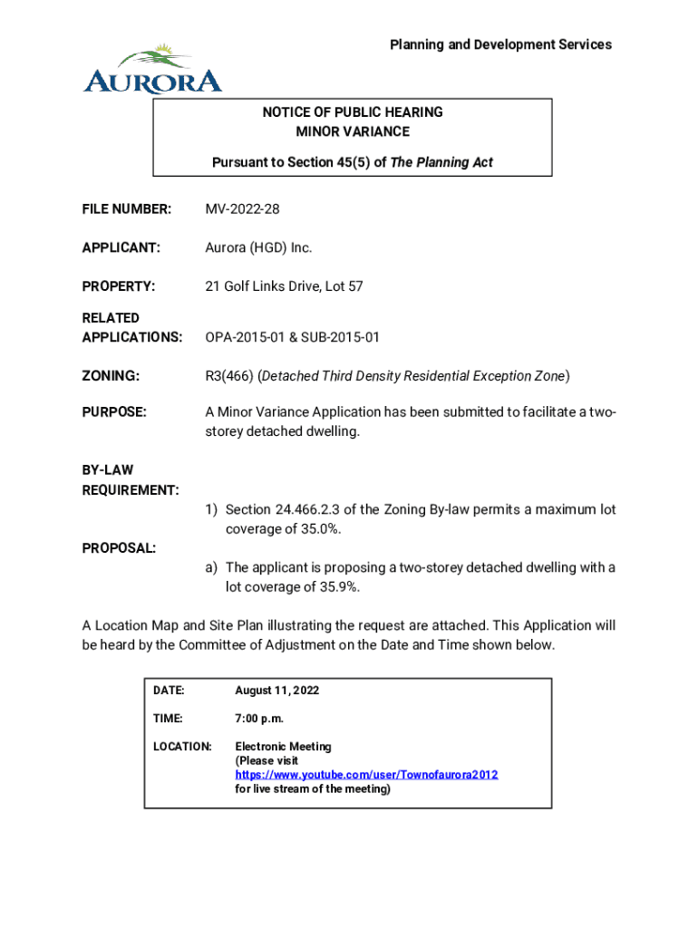 Planning and Development ServicesNOTICE OF PUBLIC HEARING MINOR VARIANCE Pursuant to Section 45(5) of The Planning Act FILE NUMBER:MV202228APPLICANT:Aurora (HAD) Inc.PROPERTY:21 Golf Links Drive,