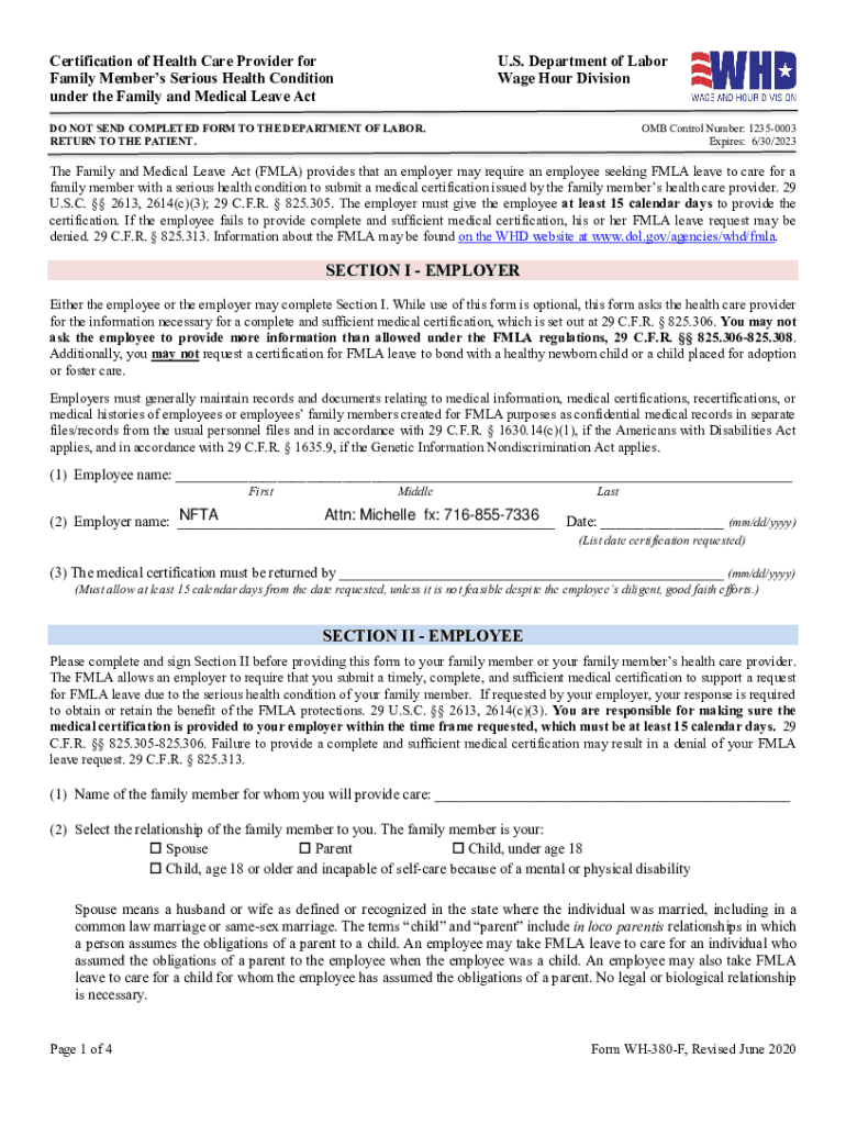 Certification of Health Care Provider for Family Members Serious Health Condition under the Family and Medical Leave Act. S. Department of Labor Wage Hour Division DO NOT SEND COMPLETED FORM TO THE