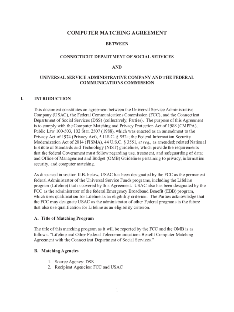 COMPUTER MATCHING AGREEMENT BETWEEN CONNECTICUT DEPARTMENT OF SOCIAL SERVICES AND UNIVERSAL SERVICE ADMINISTRATIVE COMPANY AND THE FEDERAL COMMUNICATIONS COMMISSION.INTRODUCTION This document constitutes