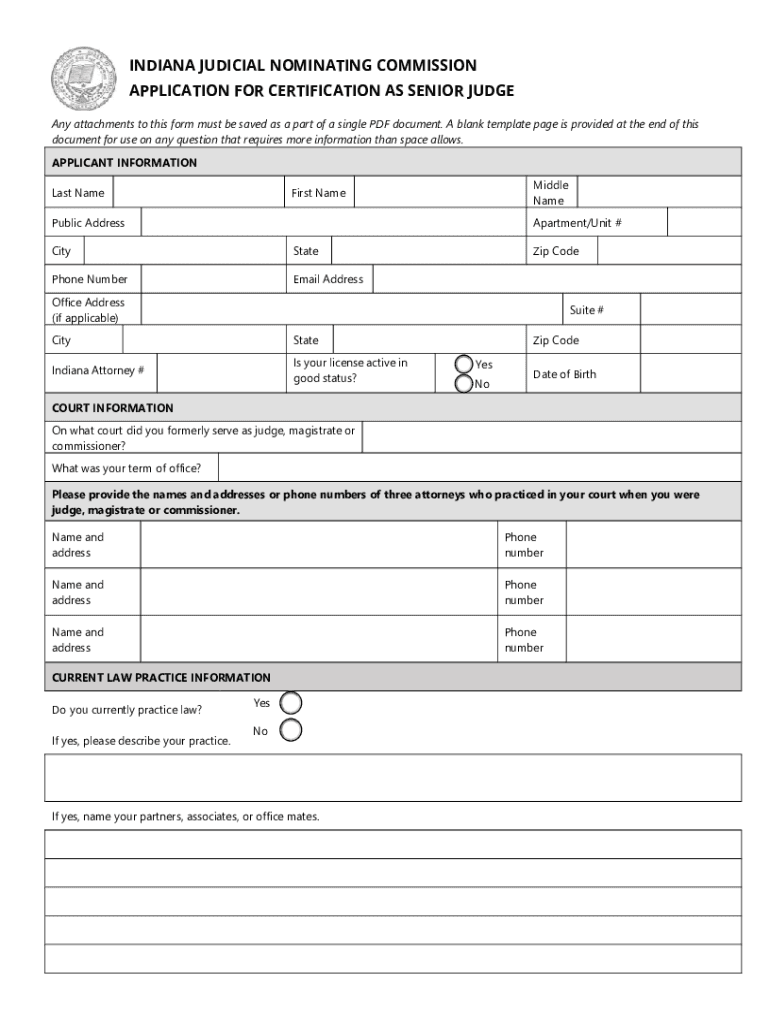 INDIANA JUDICIAL NOMINATING COMMISSION APPLICATION FOR CERTIFICATION AS SENIOR JUDGE Any attachments to this form must be saved as a part of a single PDF document. A blank template page is provided