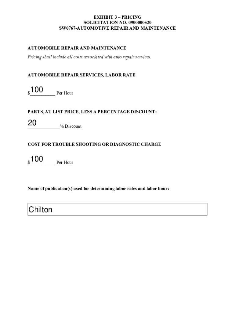 EXHIBIT 3 PRICING SOLICITATION NO. 0900000520 SW0767AUTOMOTIVE REPAIR AND MAINTENANCEAUTOMOBILE REPAIR AND MAINTENANCE Pricing shall include all costs associated with auto repair services. AUTOMOBILE