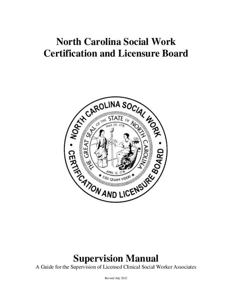 North Carolina Social Work Certification and Licensure BoardSupervision Manual A Guide for the Supervision of Licensed Clinical Social Worker Associates Revised July 2022Supervision Manual This manual