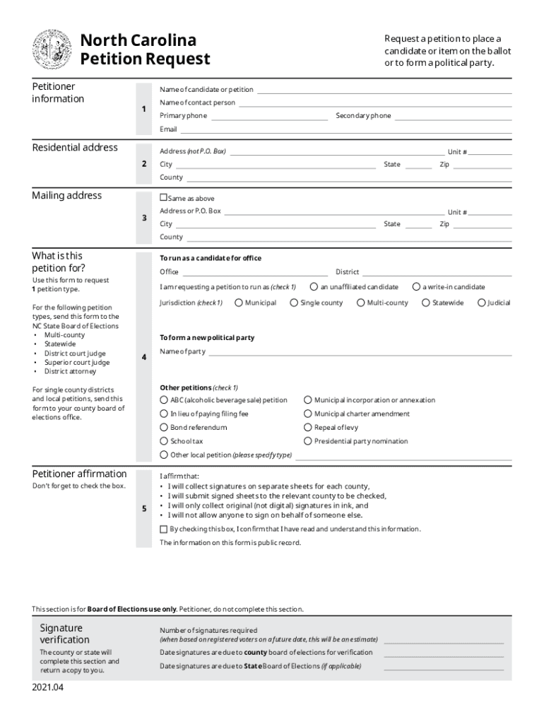 You can. Using the pdfFiller iOS app, you can edit, distribute, and sign north carolina petition request. Install it in seconds at the Apple Store. The app is free, but you must register to buy a subscription or start a free trial.