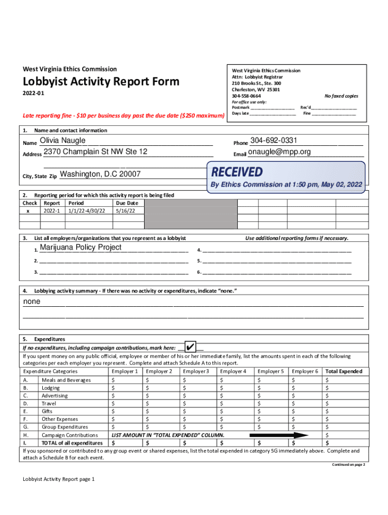 West Virginia Ethics Commission West Virginia Ethics Commission Attn: Lobbyist Registrar 210 Brooks St., Ste. 300 Charleston, WV 25301 3045580664Lobbyist Activity Report Form 202201Late reporting