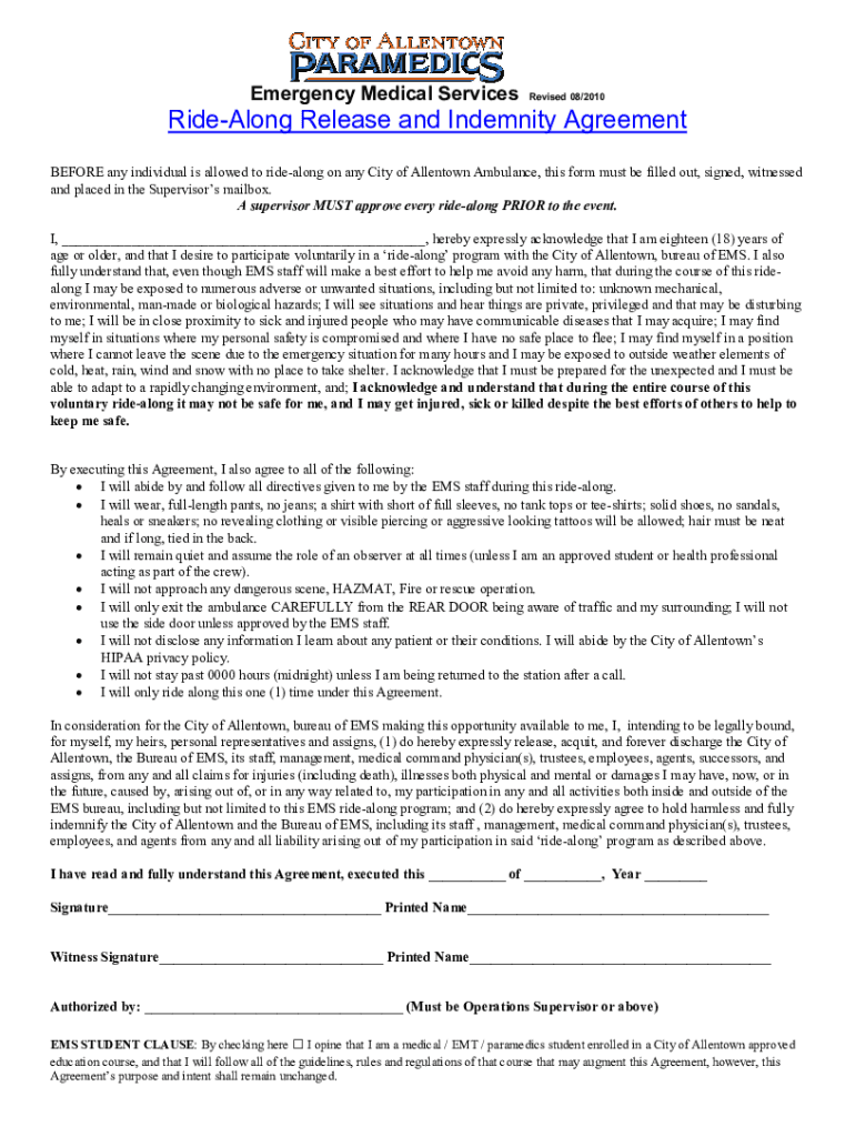 Emergency Medical ServicesRevised 08/2010RideAlong Release and Indemnity Agreement BEFORE any individual is allowed to ride along on any City of Allentown Ambulance, this form must be filled out,