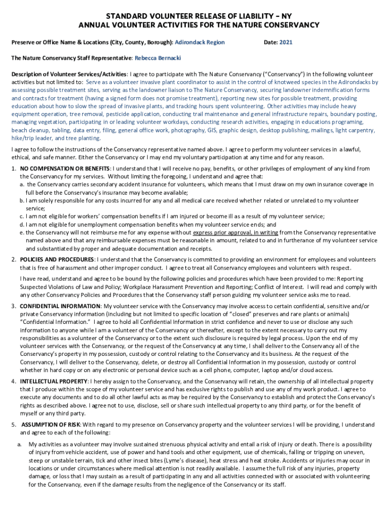 STANDARD VOLUNTEER RELEASE OF LIABILITY NY ANNUAL VOLUNTEER ACTIVITIES FOR THE NATURE CONSERVANCY Preserve or Office Name & Locations (City, County, Borough): Adirondack Regional: 2021The Nature Conservancy