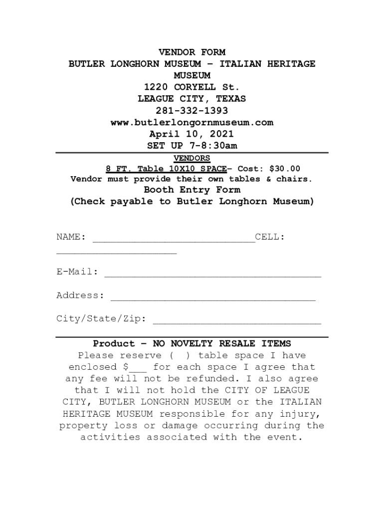 VENDOR FORM BUTLER LONGHORN MUSEUM ITALIAN HERITAGE MUSEUM 1220 CORNELL St. LEAGUE CITY, TEXAS 2813321393 www.butlerlongornmuseum.com April 10, 2021, SET UP 78:30am VENDORS 8 FT. Table 10×10 SPACE