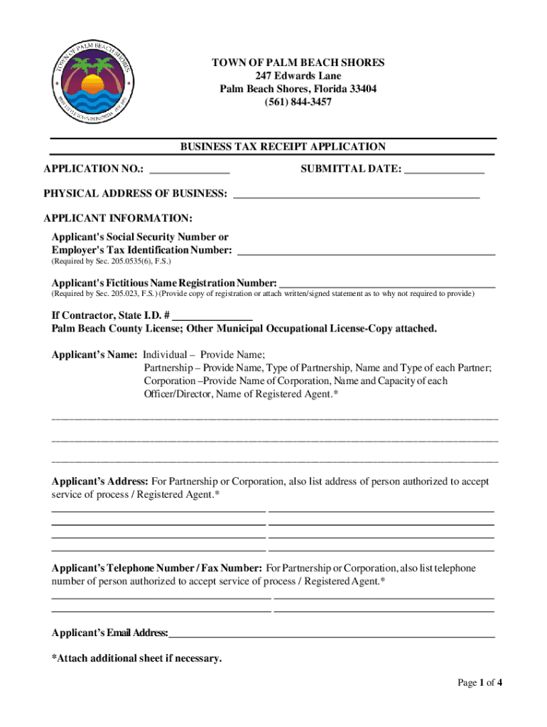 TOWN OF PALM BEACH SHORES 247 Edwards Lane Palm Beach Shores, Florida 33404 (561) 8443457BUSINESS TAX RECEIPT APPLICATION NO.: ___SUBMITTAL DATE: ___PHYSICAL ADDRESS OF BUSINESS: ___ APPLICANT INFORMATION: