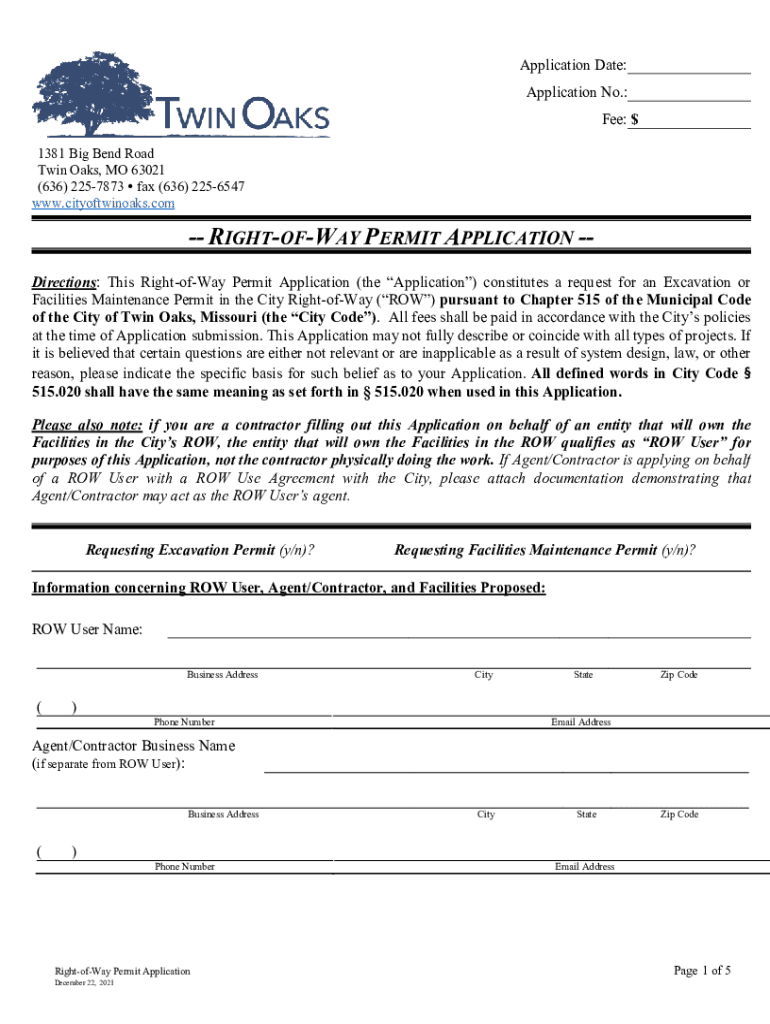 Application Date: Application No.: Fee: $1381 Big Bend Road Twin Oaks, MO 63021 (636) 2257873 fax (636) 2256547 www.cityoftwinoaks.com RIGHTOFWAY PERMIT APPLICATION Directions: This RightofWay Permit