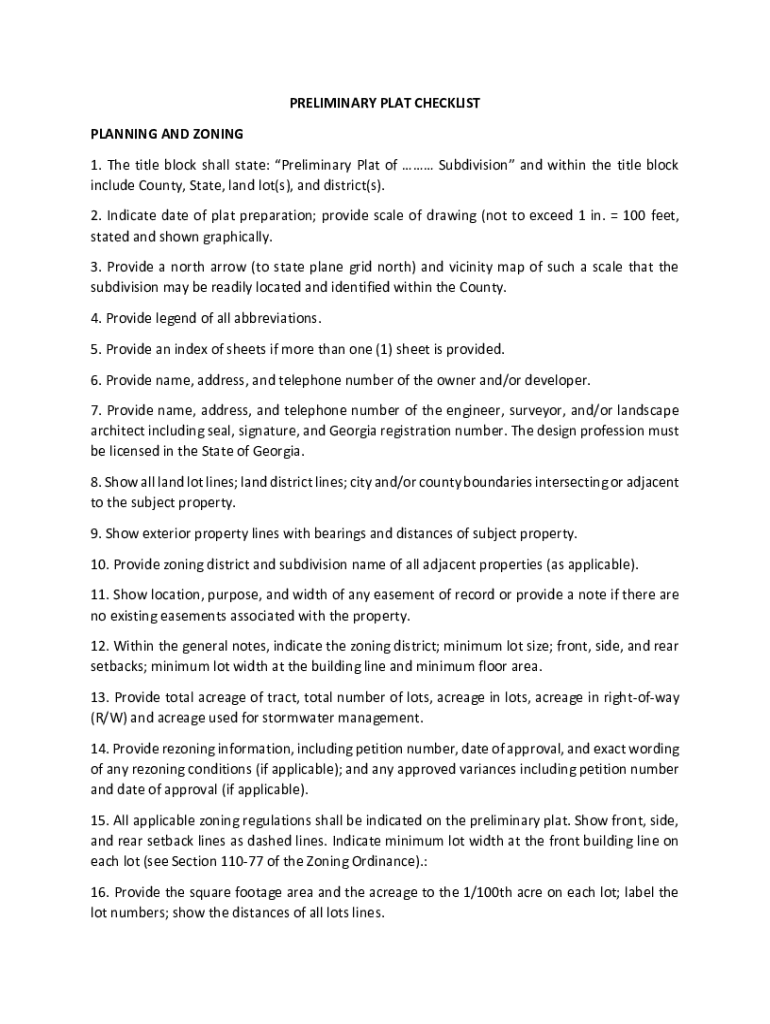 PRELIMINARY PLAT CHECKLIST PLANNING AND ZONING 1. The title block shall state: Preliminary Plat of Subdivision and within the title block include County, State, land lot(s), and district(s). 2. Indicate