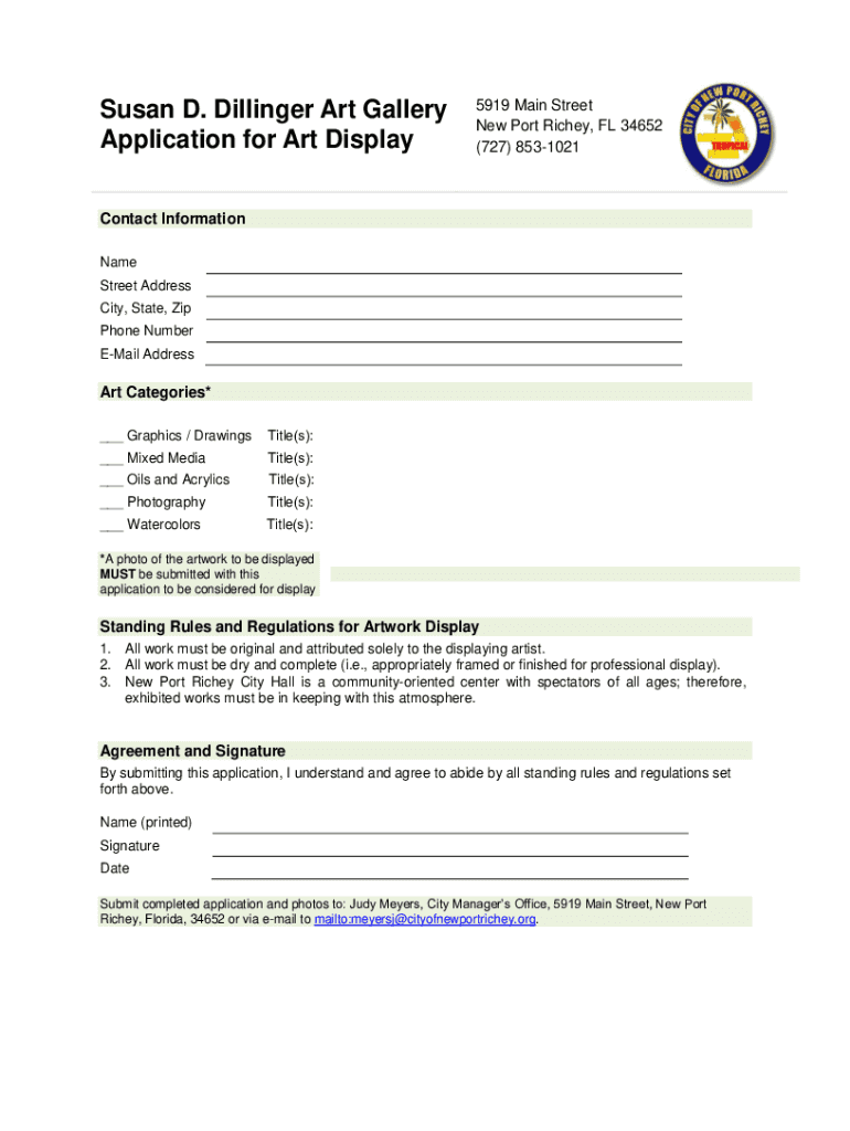 Susan D. Dillinger Art Gallery Application for Art Display5919 Main Street New Port Richey, FL 34652 (727) 8531021Contact Information Name Street Address City, State, Zip Phone Number Email Address