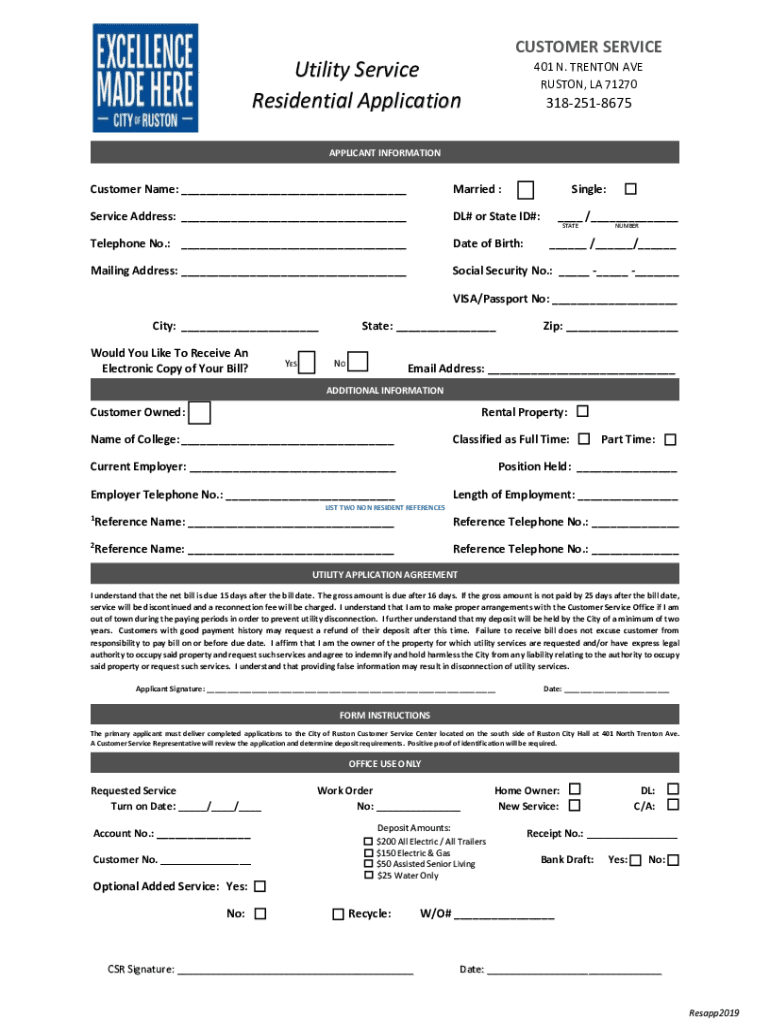 CUSTOMER Serviceability Service Residential Application401 N. TRENTON AVE HUSTON, LA 712703182518675APPLICANT INFORMATIONCustomer Name: ___Married :Single:Service Address: ___DL# or State ID#:Telephone