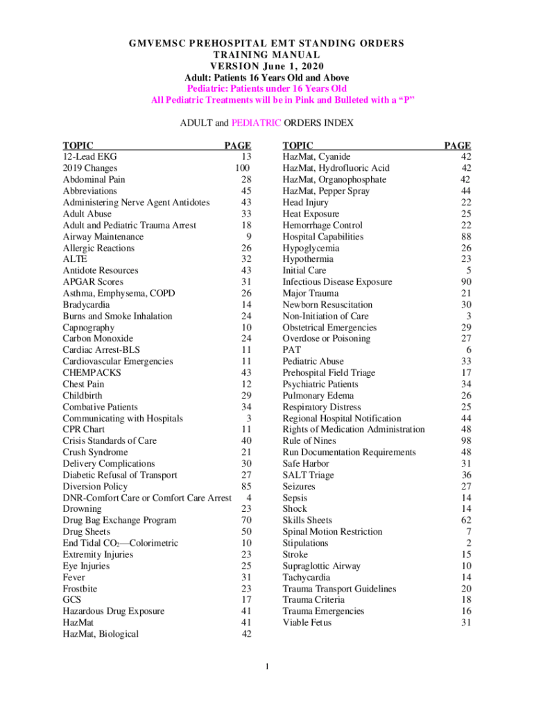 GIVES PREHOSPITAL EMT STANDING ORDERS TRAINING MANUAL VERSION June 1, 2020, Adult: Patients 16 Years Old and Above Pediatric: Patients under 16 Years Old All Pediatric Treatments will be in Pink and