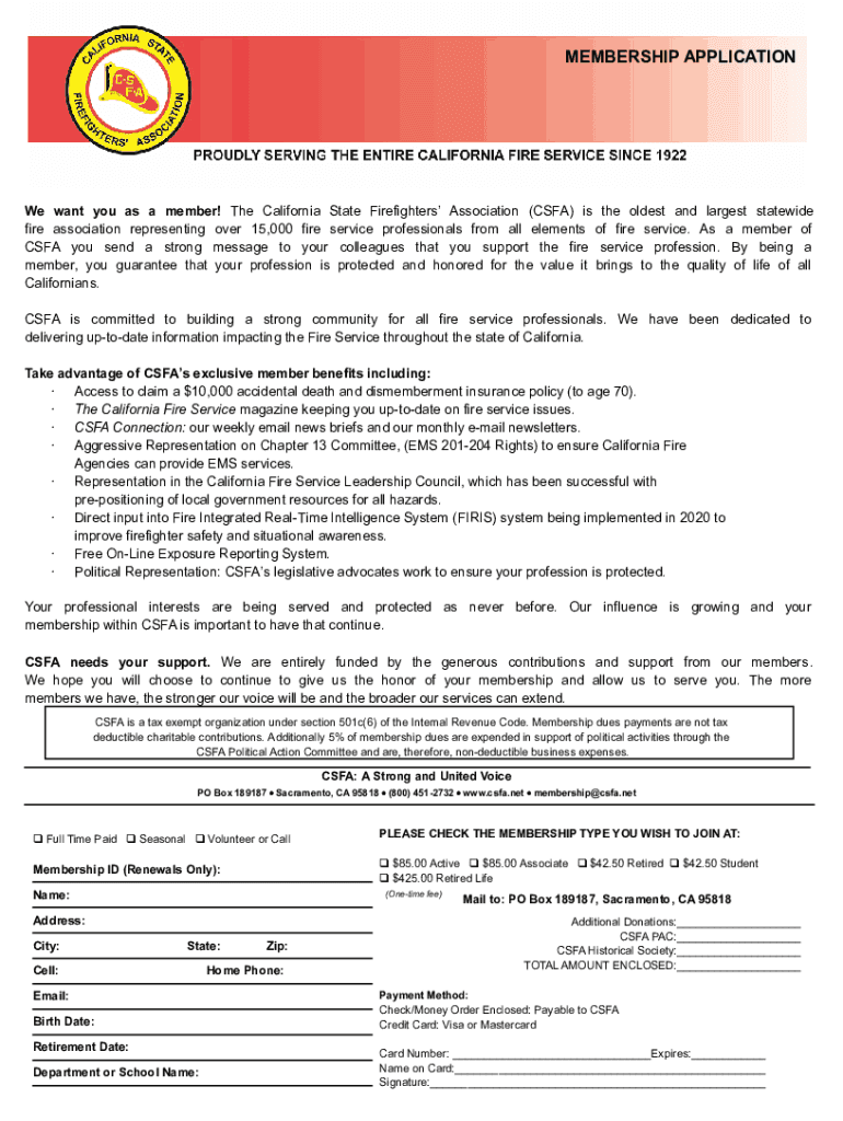MEMBERSHIP Application want you as a member! The California State Firefighters Association (CSA) is the oldest and largest statewide fire association representing over 15,000 fire service professionals