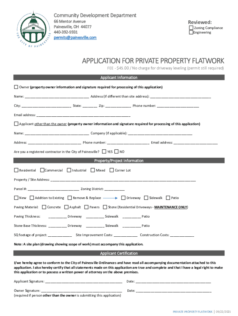 Community Development Department 66 Mentor Avenue Painesville, OH 44077 4403925931 permits@painesville.comReviewed: Zoning Compliance EngineeringAPPLICATION FOR PRIVATE PROPERTY FLATWORM FEE $45.00