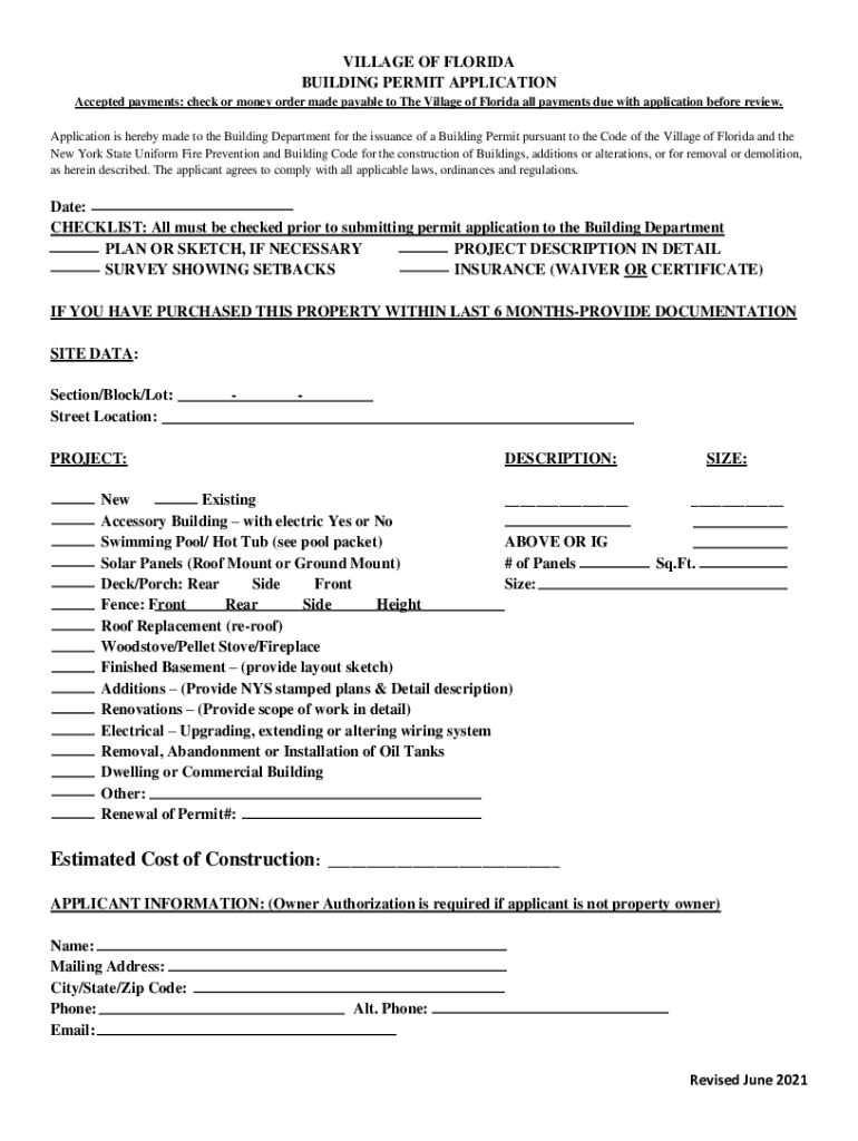 VILLAGE OF FLORIDA BUILDING PERMIT APPLICATION Accepted payments: check or money order made payable to The Village of Florida all payments due with application before review. Application is hereby