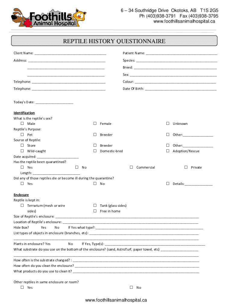 6 34 South ridge Drive Kooks, AB T1S 2G5 pH (403)9383791 Fax (403)9383795 www.foothillsanimalhospital.caREPTILE HISTORY QUESTIONNAIRE Client Name: ___Patient Name: ___Address: ___Species: ______Breed: