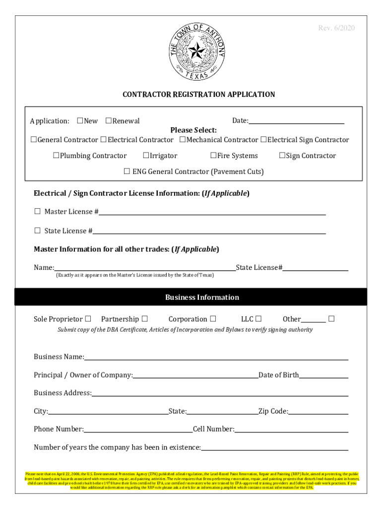 Rev. 6/2020CONTRACTOR REGISTRATION APPLICATION Date:A application: New RenewalPlease Select: General Contractor Electrical Contractor Mechanical Contractor Electrical Sign Contractor Plumbing ContractorFire