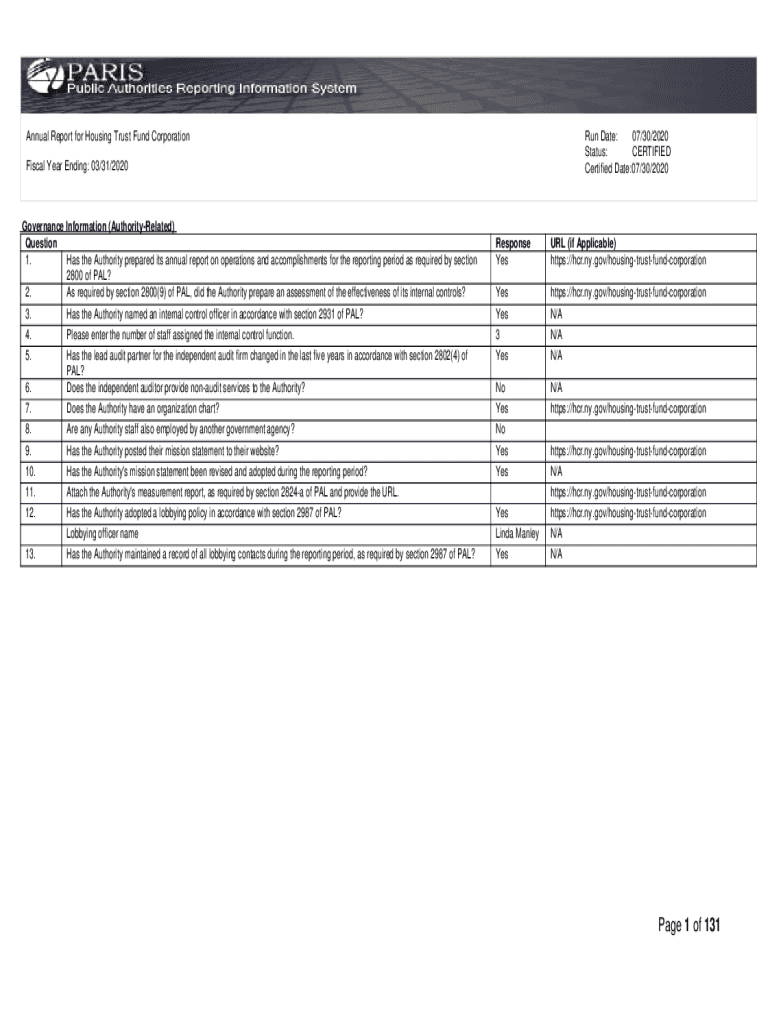 Annual Report for Housing Trust Fund Corporation Date: 07/30/2020 Status: CERTIFIED Date:07/30/2020Fiscal Year Ending: 03/31/2020Governance Information (AuthorityRelated) Question 1. Has the Authority