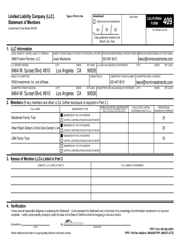 Statement of Membership or Print in Ink. Amendment(Government Code Section 84109)