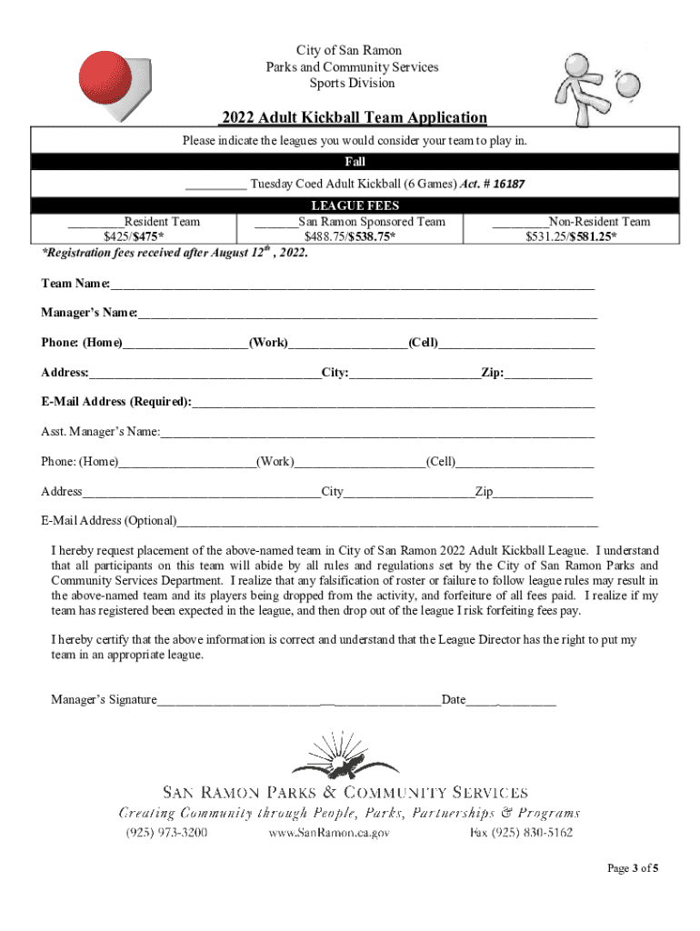 City of San Ramon Parks and Community Services Sports Division Registration Information2022 Fall Kickball League Thanks for your interest in our Adult Coed Kickball League! The City of San Ramon offers