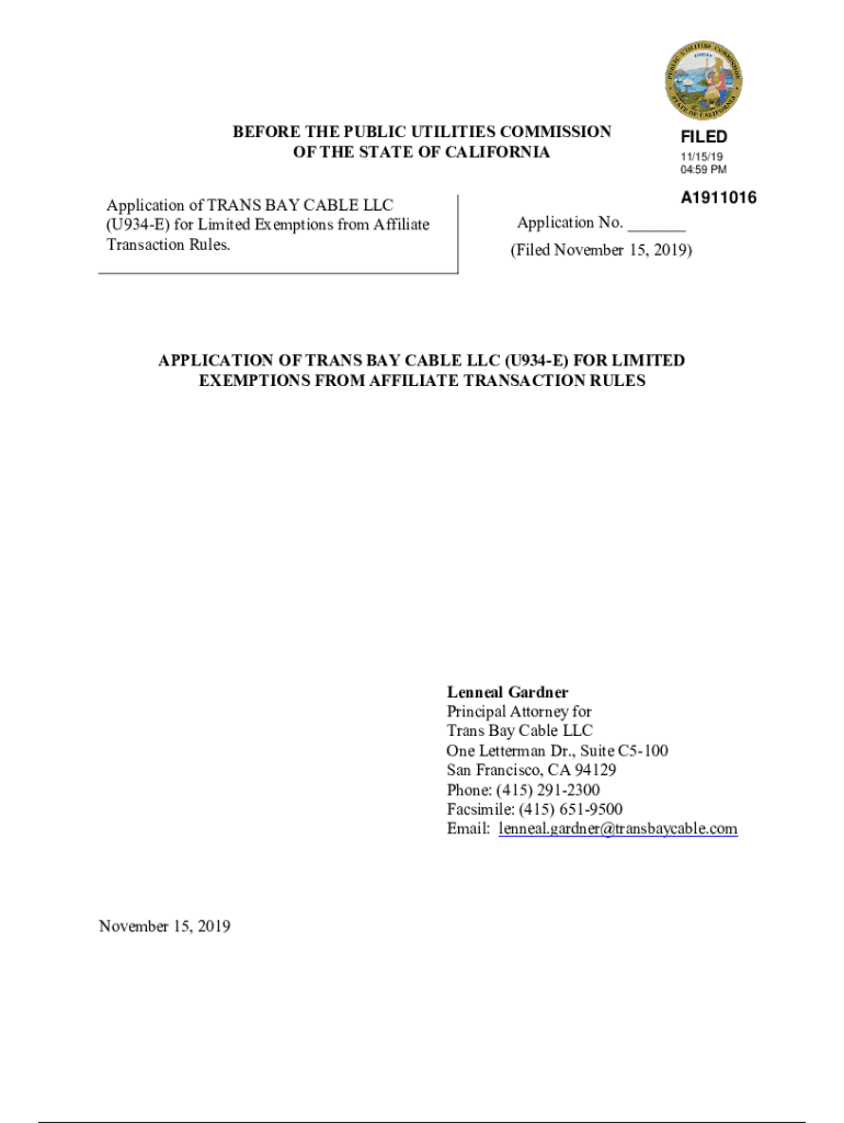 BEFORE THE PUBLIC UTILITIES COMMISSION OF THE STATE OF CALIFORNIA Application of TRANS BAY CABLE LLC (U934E) for Limited Exemptions from Affiliate Transaction Rules. FILED 11/15/19 04:59 PMA1911016