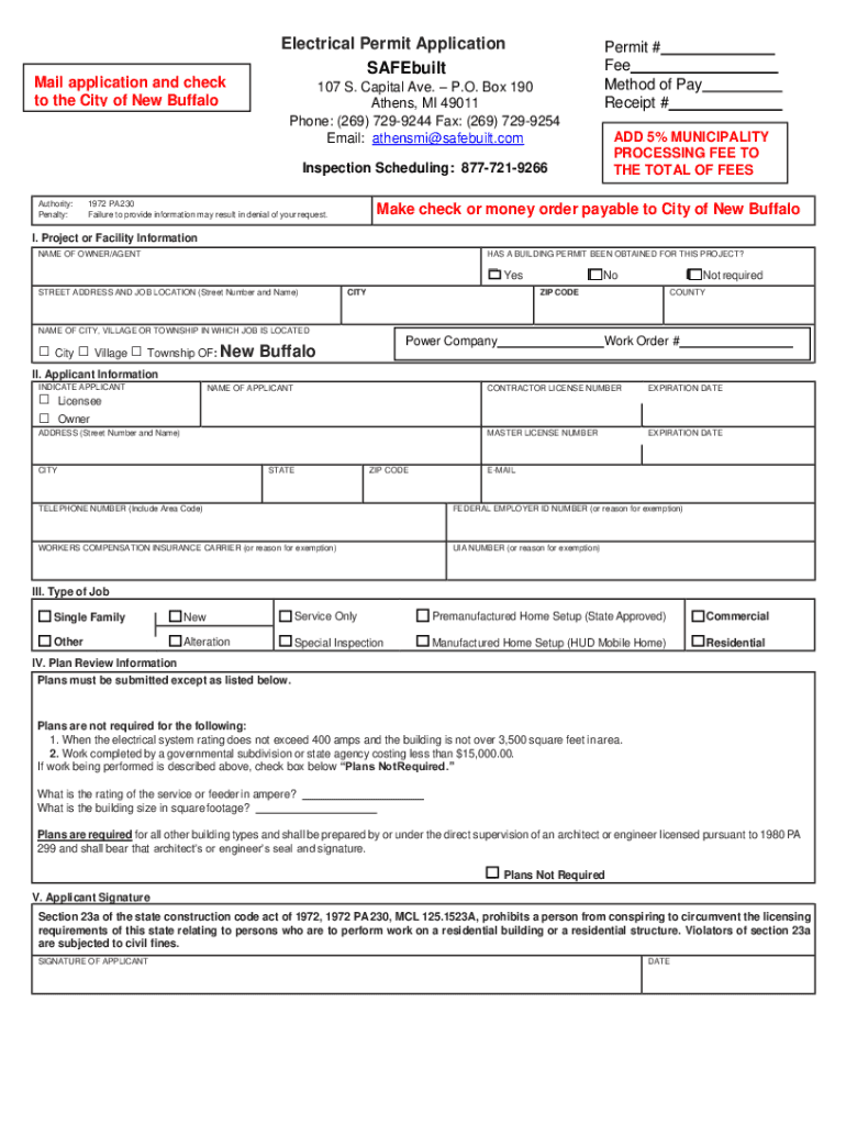Mail application and check to the City of New BuffaloElectrical Permit Application SAFEbuiltPermit # Fee Method of Pay Receipt #107 S. Capital Ave. P.O. Box 190 Athens, MI 49011 Phone: (269) 7299244