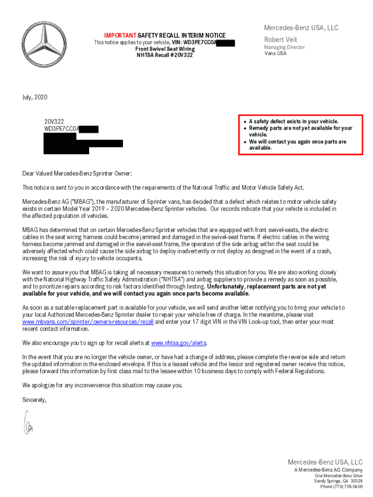 Mercedes-Benz USA, LLC IMPORTANT SAFETY RECALL INTERIM Notices notice applies to your vehicle, VIN: WD3PE7CC0A Front Swivel Seat Wiring NHTSA Recall #20V322Robert Vat Managing Director Vans USA July,