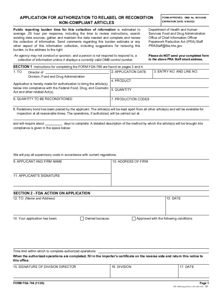 It is important to consult the specific regulations and guidelines provided by the FDA to determine the exact requirements for filling out and submitting the FDA 766 application form.