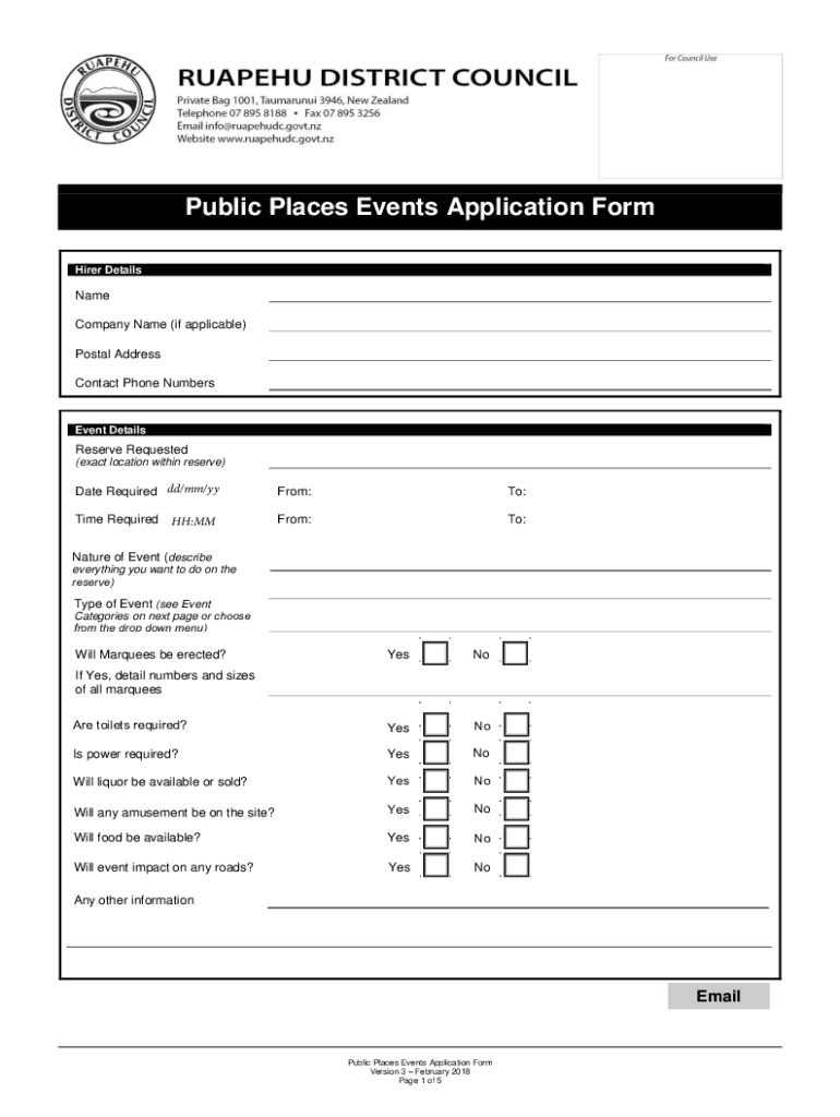 Public Places Events Application Form Hired DetailsName Company Name (if applicable) Postal Address Contact Phone NumbersEvent DetailsReserve Requested (exact location within reserve)Date Required
