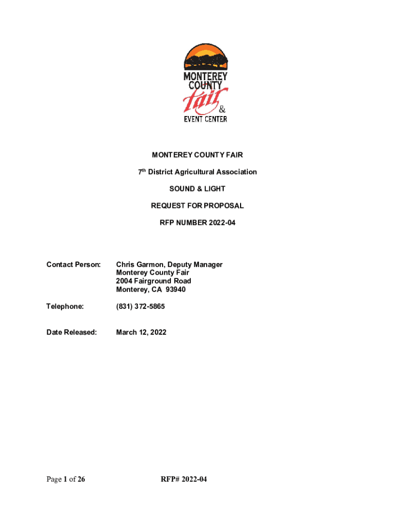 MONTEREY COUNTY FAIR 7th District Agricultural Association SOUND & LIGHT REQUEST FOR PROPOSAL RFP NUMBER 202204Contact Person:Chris Harmon, Deputy Manager Monterey County Fair 2004 Fairground Road