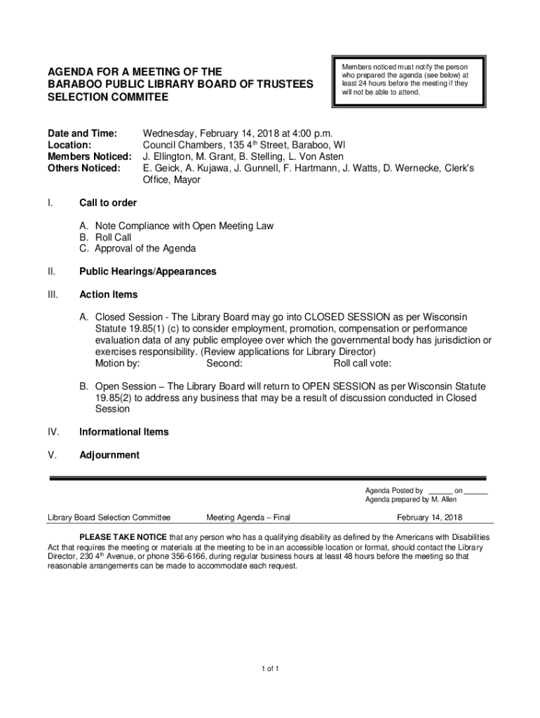 AGENDA FOR A MEETING OF THE BAMBOO PUBLIC LIBRARY BOARD OF TRUSTEES SELECTION Commiserate and Time: Location: Members Noticed: Others Noticed:I. Members noticed must notify the person who prepared